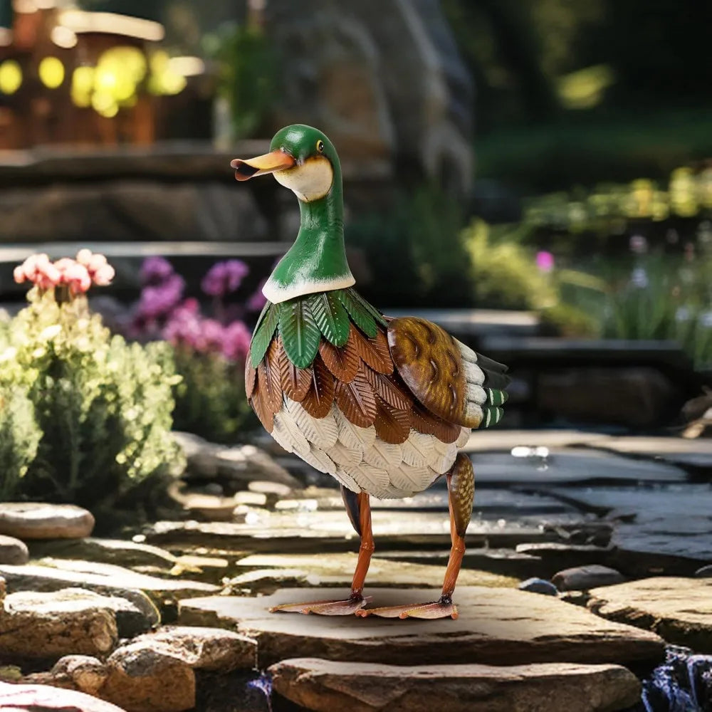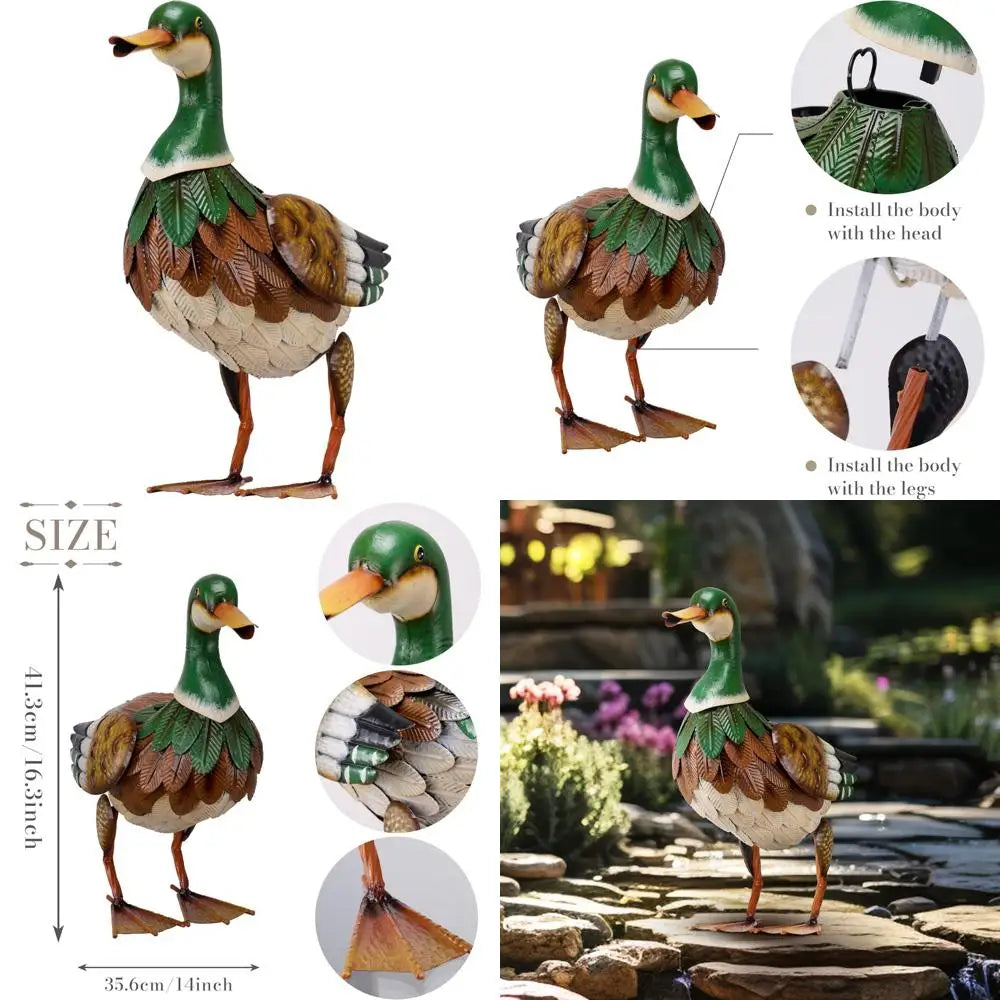 This green and yellow metal duck statue is meticulously designed with intricate details and a vibrant color scheme, embodying the essence of nature. Its lifelike appearance and hand-painted finish make it a stunning art piece that brings a touch of whimsy and playfulness to any garden or outdoor space. Crafted from durable, corrosion-resistant metal, this statue is built to withstand the test of time. The rust-proof materials ensure that it can endure various weather conditions while maintaining its beauty. The fine craftsmanship guarantees a high-quality product that will impress art enthusiasts. Measuring 16 inches in height, this duck statue strikes a perfect balance in size, making it noticeable yet fitting for various settings. It can be placed in a farmhouse yard, garden, pathway, poolside, driveway, flowerbed, or patio, adding a rustic charm to the surroundings. Assembly is a breeze with no tools required. Simply connect the different parts to quickly and easily put the statue together. This metal duck statue makes an ideal gift for birthdays, Christmas, Mother's Day, housewarmings, or any special occasion. Its artistic value and timeless appeal make it a truly exceptional present.