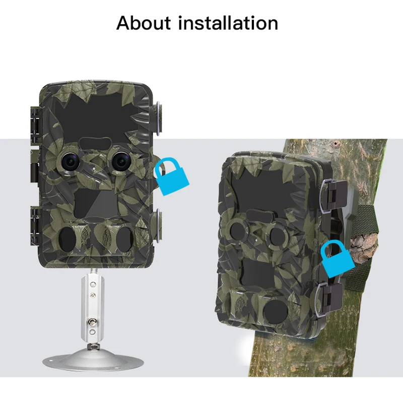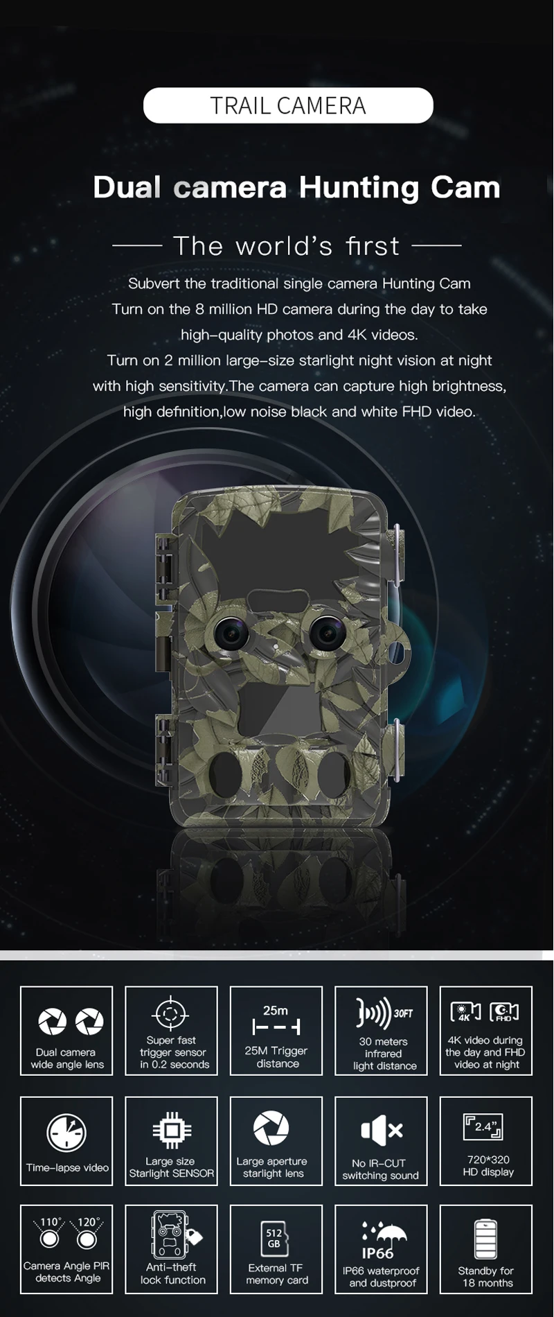 A hunting camera with two cameras. One 8-megapixel camera captures high-quality images of normal brightness during the day, and the other 2-megapixel starlight camera captures high-brightness, high-resolution, and low-noise images in a dark environment at night.