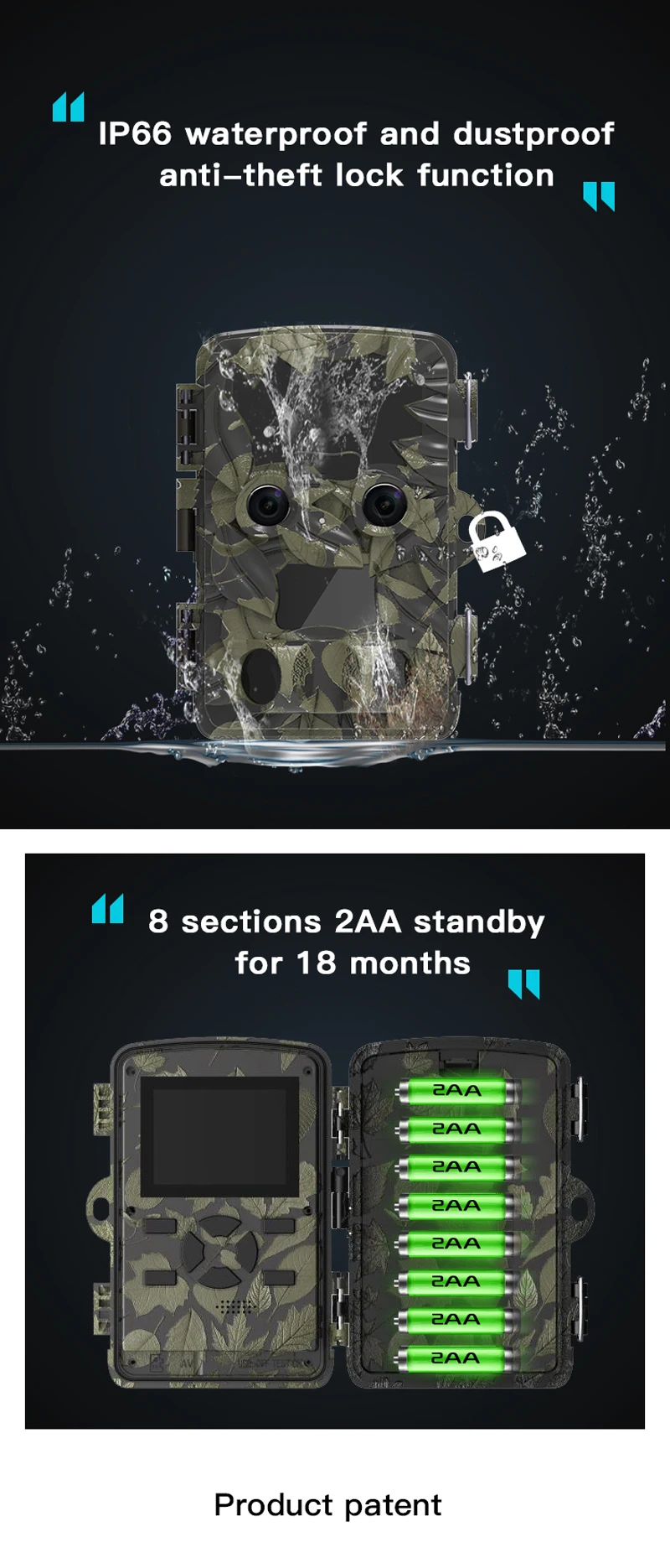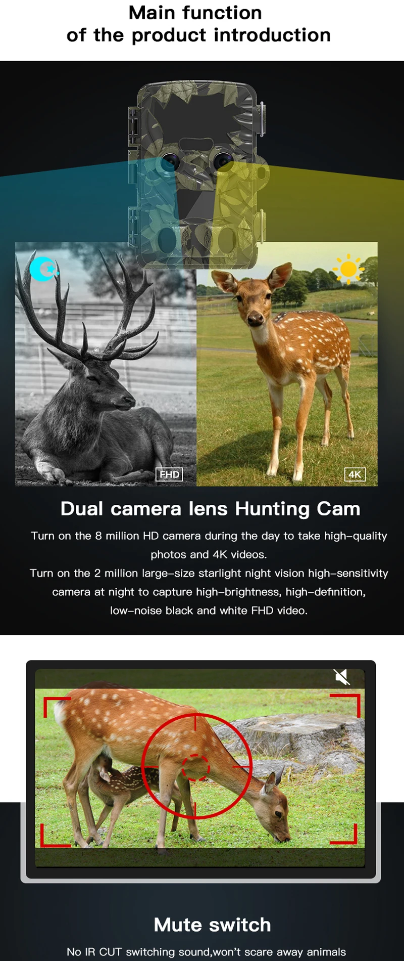 【Unique Dual Camera Design】 The 8 megapixel HD wildlife camera works during the day and the high-sensitivity starlight night vision camera is activated at night. H8201 wildlife camera surpasses the conventional single camera and achieves excellent night vision with low noise and high resolution