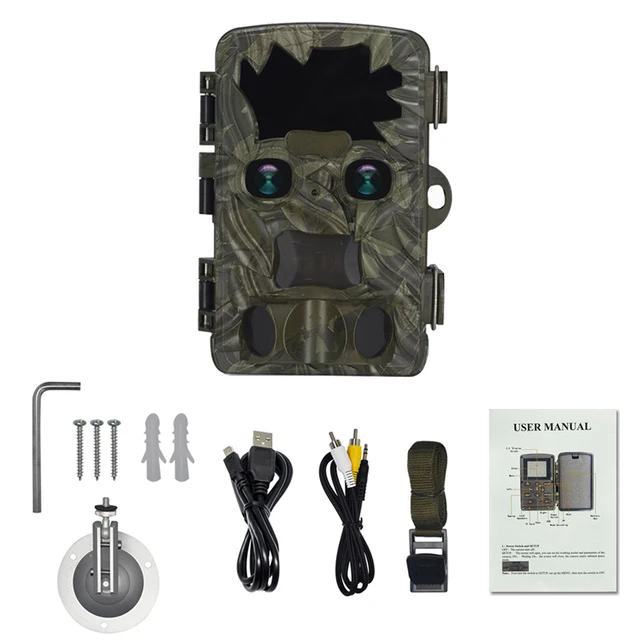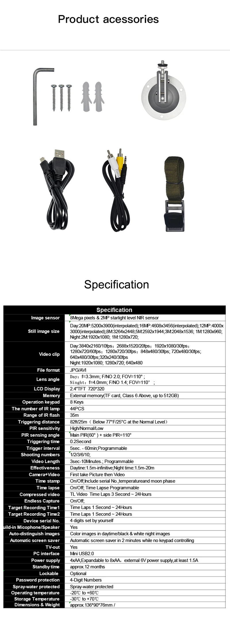 【Packing List】: Hunting Camera ×1,User manual ×1,USB Cable ×1,AV Cable ×1,Bandage Belt ×1,Wall bracket ×1.