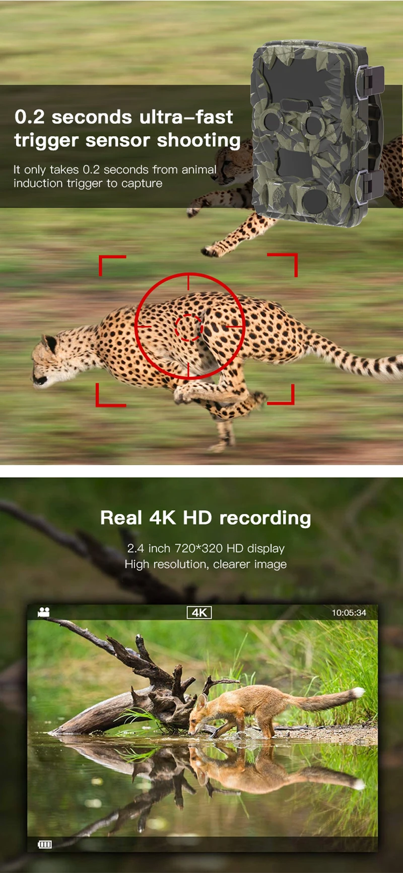 【4K HD videos and 120° wide angle】: the H8201 wildlife camera high resolution day camera offers 4K videos and 20MP photos in high quality. With the night vision camera with starlight, you can record high-resolution black and white FHD videos with high brightness at night. The 120 degree ultra wide angle allows full screen monitoring of the wildlife world.