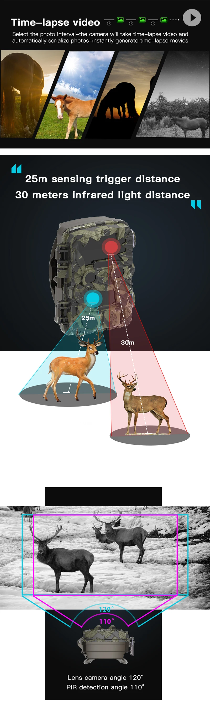 【0.1 s trigger speed and 25 m trigger distance】: The cool night vision wildlife camera fast start in 0.1 second, shooting completed in 0.2S and Trigger distance of 25m so you don't miss any wonderful moments in front of the camera.