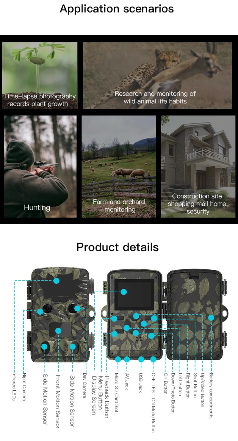 【Multifunctional】: Time-lapse photography records plant growth/Research and monitoring of wild animal life habits/Hunting/Farm and orchard monitoring/Construction site shopping mall home security