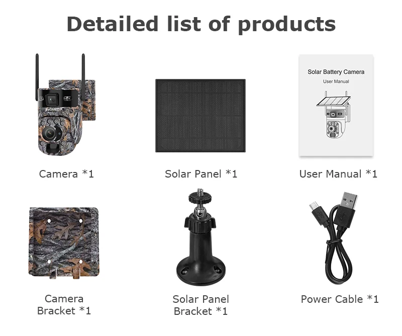 Camera *1/Solar panel *1/Package box *1/Instruction manual *1/Bracket *1/Screw package *1